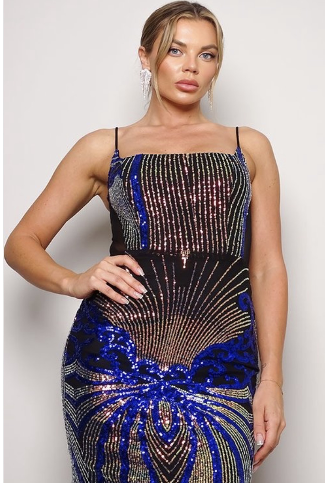Haz una entrada deslumbrante con nuestro magnífico Vestido de Gala en un deslumbrante tornasol diseñado con un corte ajustado y tirantes con hombros descubiertos. Este impresionante vestido combina la elegancia y el glamour con un toque de sofisticación moderna, ofreciéndote un look que seguro te hará destacar en cualquier evento especial. Confeccionado con tela de la más alta calidad y una meticulosa atención al detalle, este vestido garantiza un ajuste ceñido que realza tus curvas y te hace sentir segura y radiante.