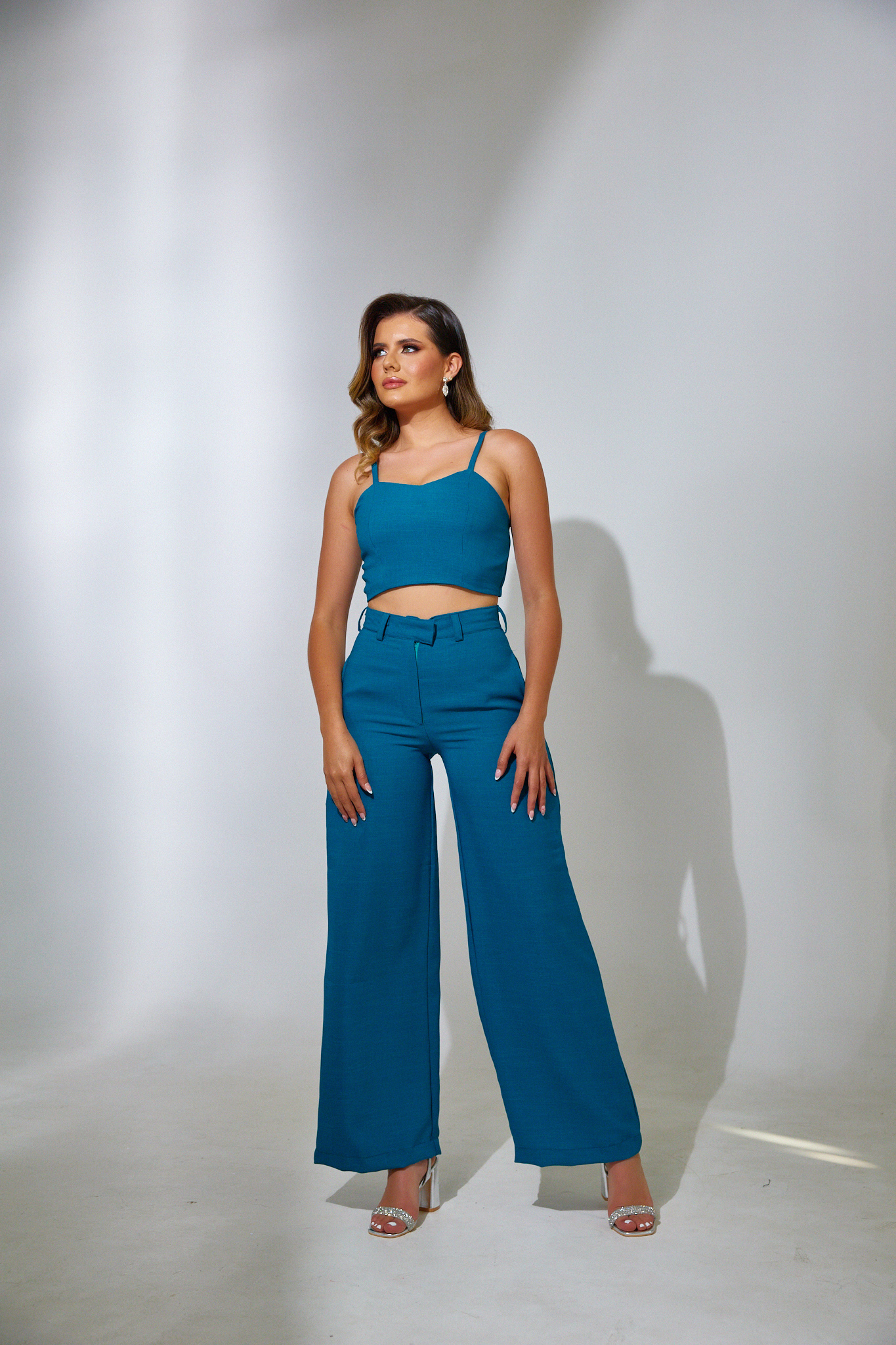 hermoso conjunto en casimir volk ideal para usar en un evento formal y al mismo tiempo para el día a día, corte de pantalón recto con top básico de tirantes en un color azul petroleo que resalta tu color de piel.